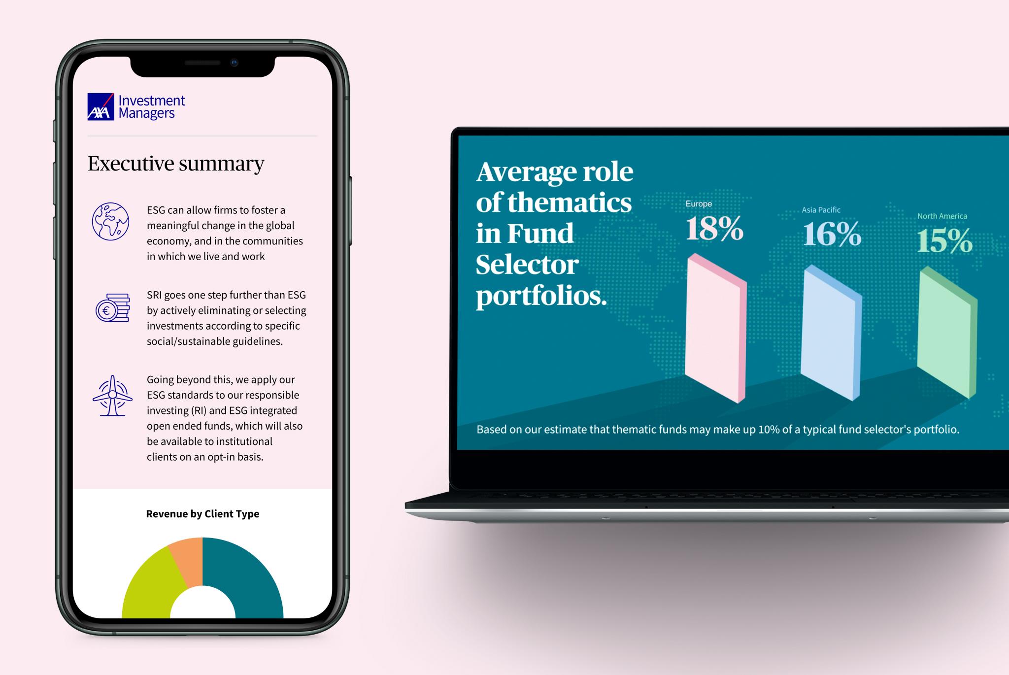 Good project management and sign-off process was essential as this was a collaborative effort between AXA and Broadridge and all our design elements had to be agreed by both. They had to approve our visual look and interpretation of the brand guidelines as well as the way we presented research findings. We worked closely with AXA’s brand team in France and the insights team at Broadridge to ensure that everyone was happy.