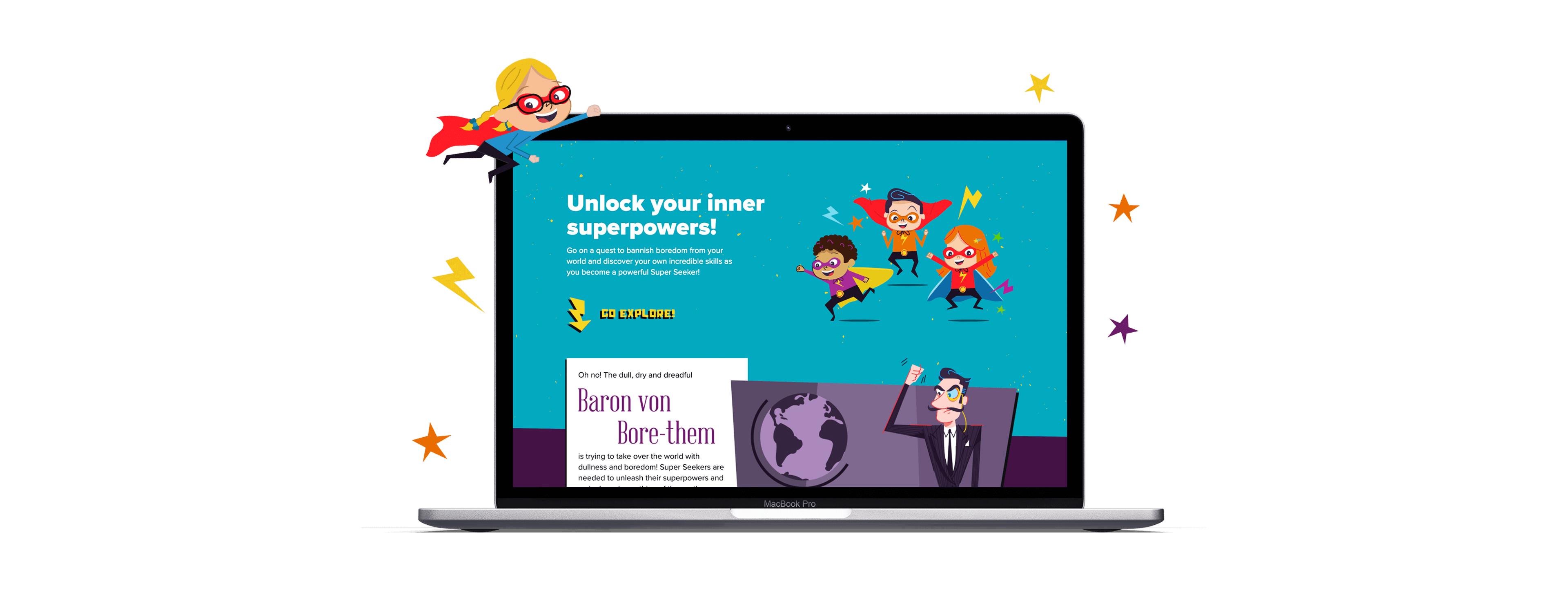 Barnardo’s wanted to create a narrative to engage children, parents and carers alike. We worked in collaboration with Barnardo’s to develop these characters. The vision for the Super Seeker heroes and heroines brought personality and realism to the concept. The villainous Baron von Bore-Them is intent on spreading boredom to the farthest reaches of the globe and only the Super Seekers can help stop him. They must complete all the activities, each earning them a life skill badge enabling them to defeat the Baron.