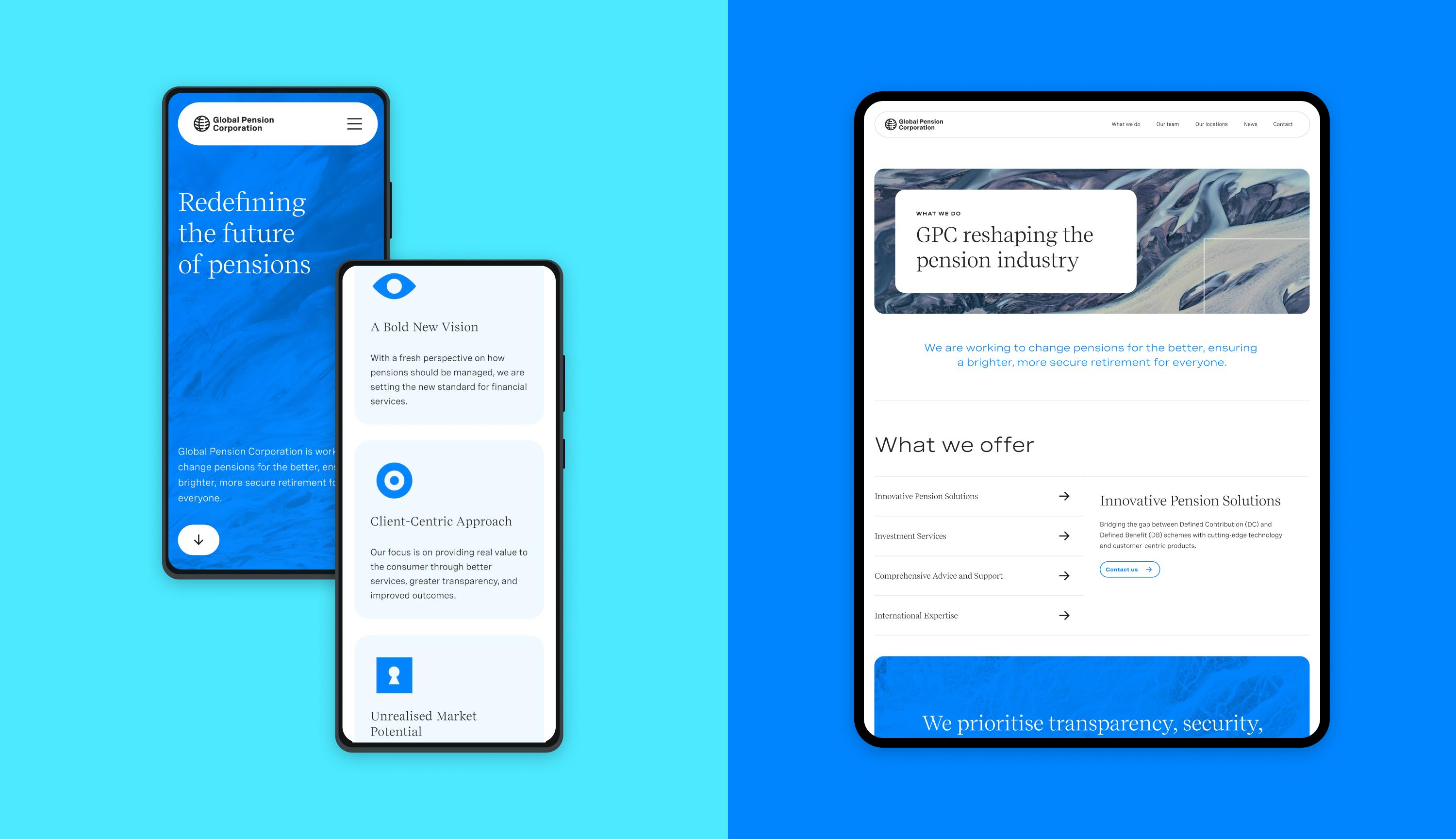 We worked closely with the client to design a brand approach and visual identity that would convey strength, trustworthiness, and modernity. A colour palette was chosen to evoke tranquility and stability, while gradients were used to add depth and sophistication. The primary brand logo features the full 'Global Pension Corporation' name, with a simplified 'GPC' variant for specific brand applications and avatar use. A clear naming hierarchy was developed to maintain consistency across the organisation's global regions and business units to provide clarity to existing and new clients.