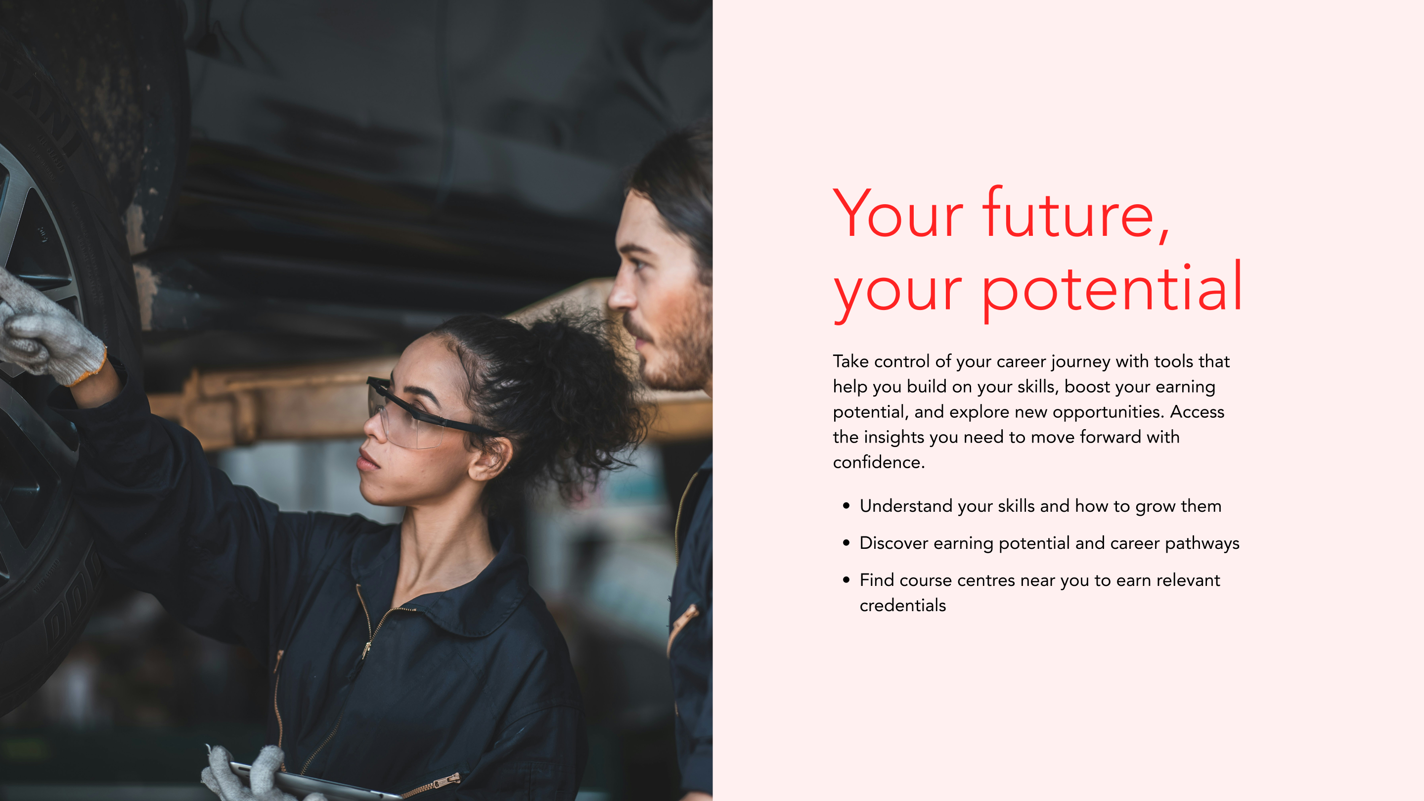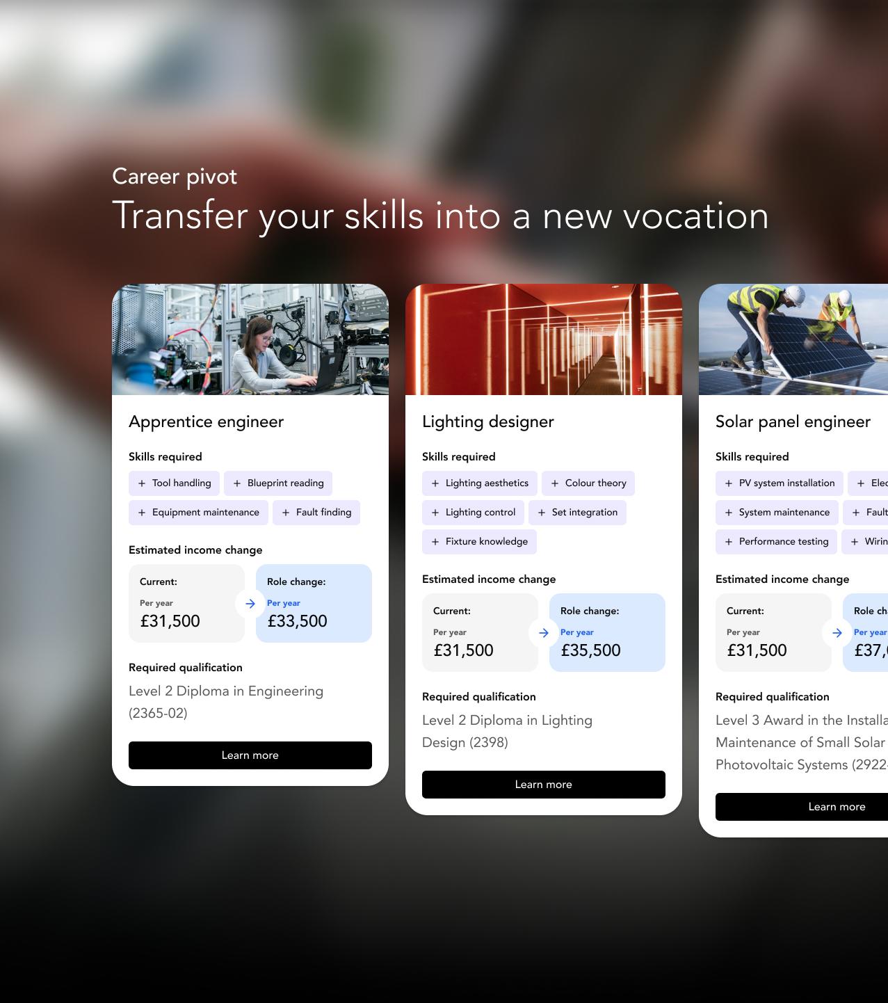 We evolved the experience across three key qualification and career segments. We built content and user flows around skills, earnings insights, job relevance and personalised recommendations. The resulting prototype helps learners understand their strengths, compare income potential, explore job roles and identify the qualifications that can move them forward.