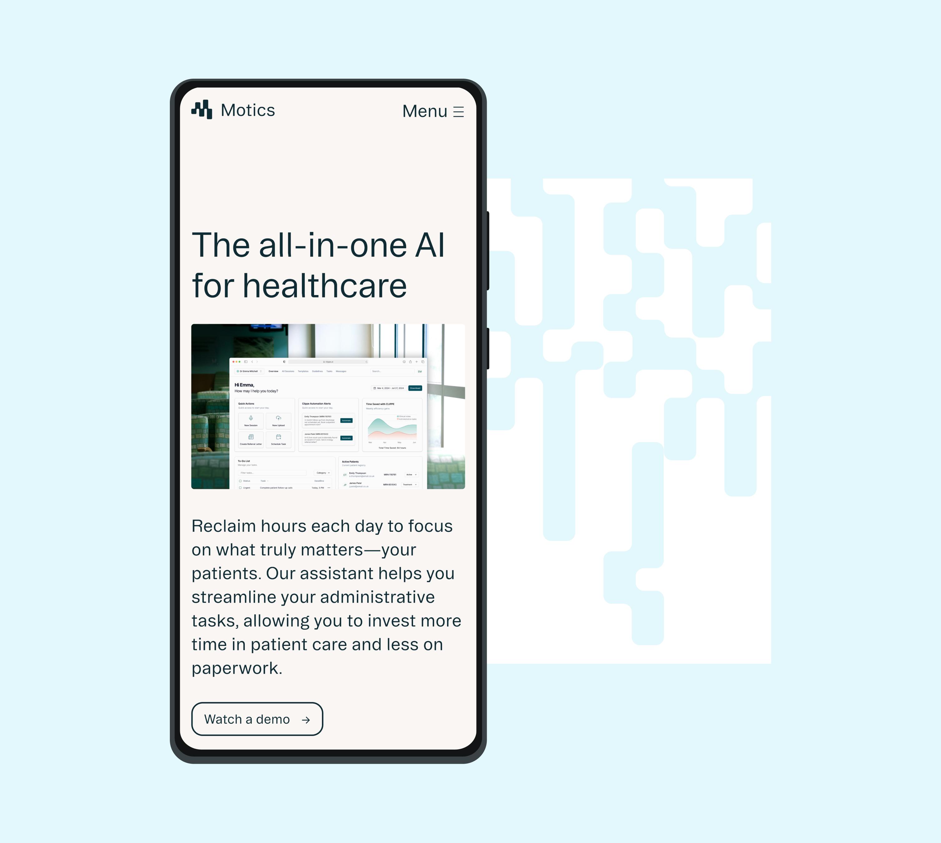 The market for AI in healthcare is booming with the opportunity to make real improvements in patient safety and efficiencies. With so much noise, how can an independent change-maker stand out? Motics automates clinical note taking, referral letters, and more to save hours a day, enabling clinicians and hospitals to spend time doing the things that really matter. The tool helps to improve patient safety, flag errors and deliver a much more efficient method to manage compliance. It delivers a complete AI strategy with full compliance, adhering to NHS and HCPC standards, minimising errors and improving documentation quality.