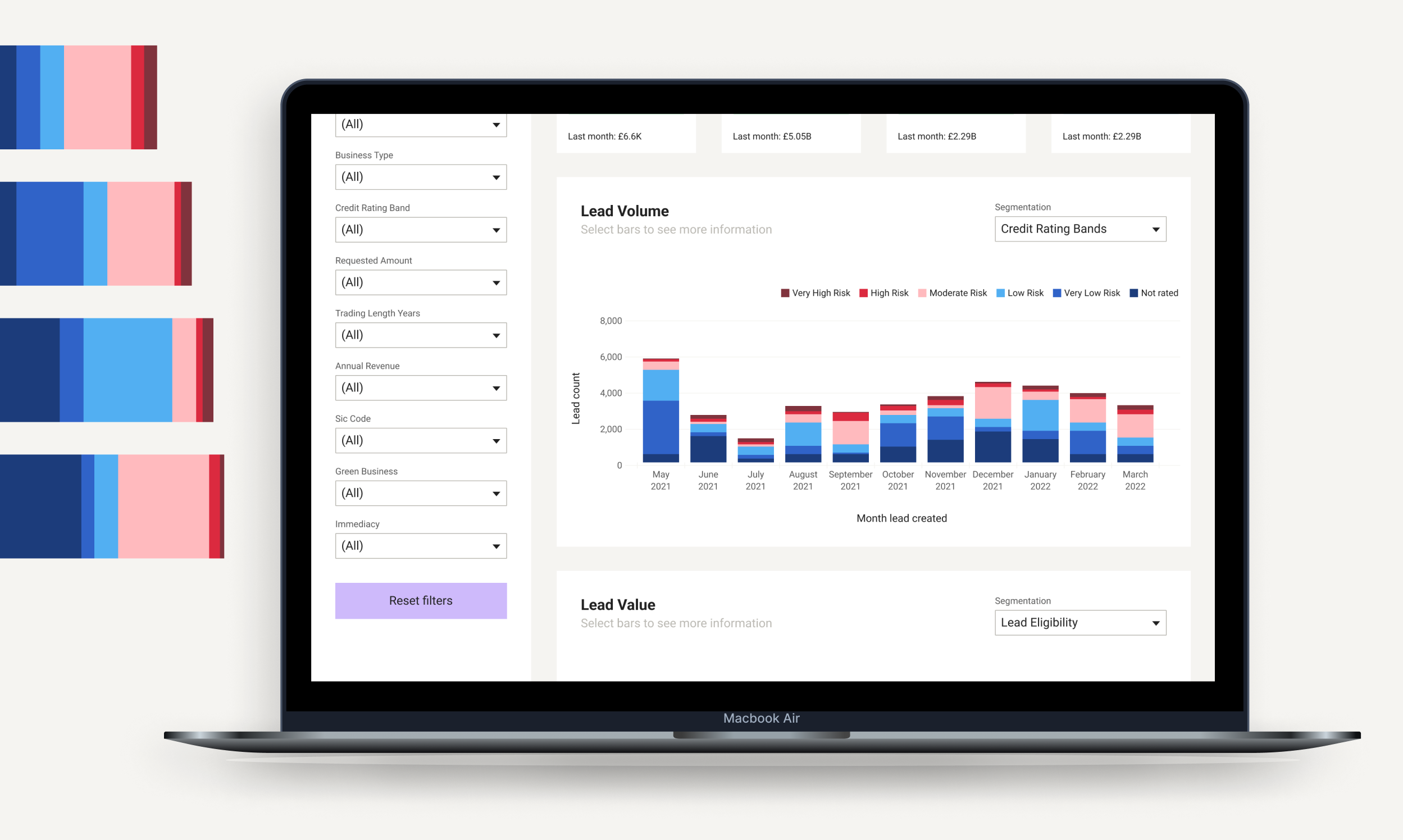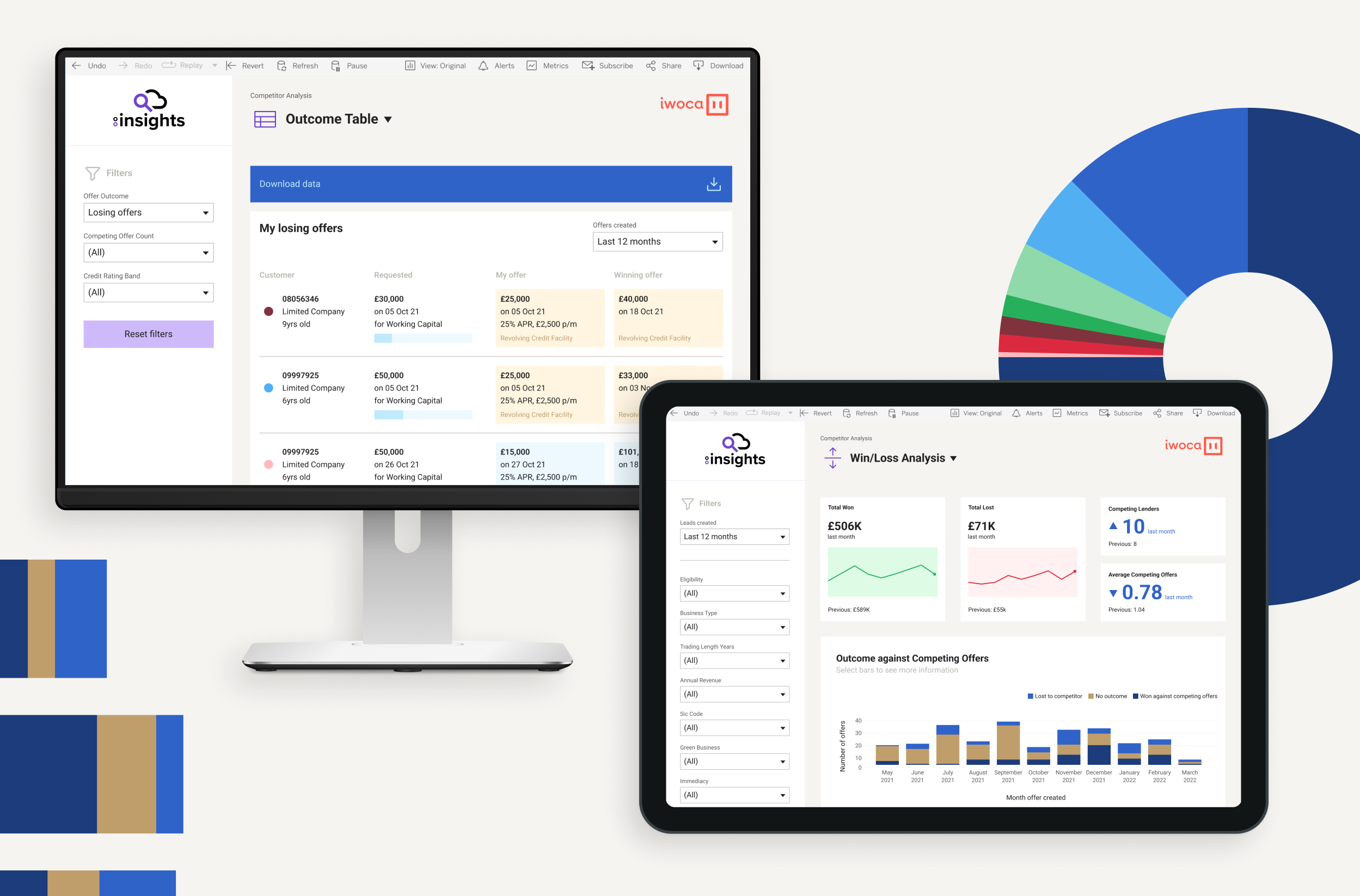 We collaborated with Funding Options to create FC:Insights, working on the UX, UI and visual design. Lenders can embed their products in the platform and through granular trend data they can understand their position relative to other lenders, adapt their products and pricing, see new opportunities and make commercial decisions.