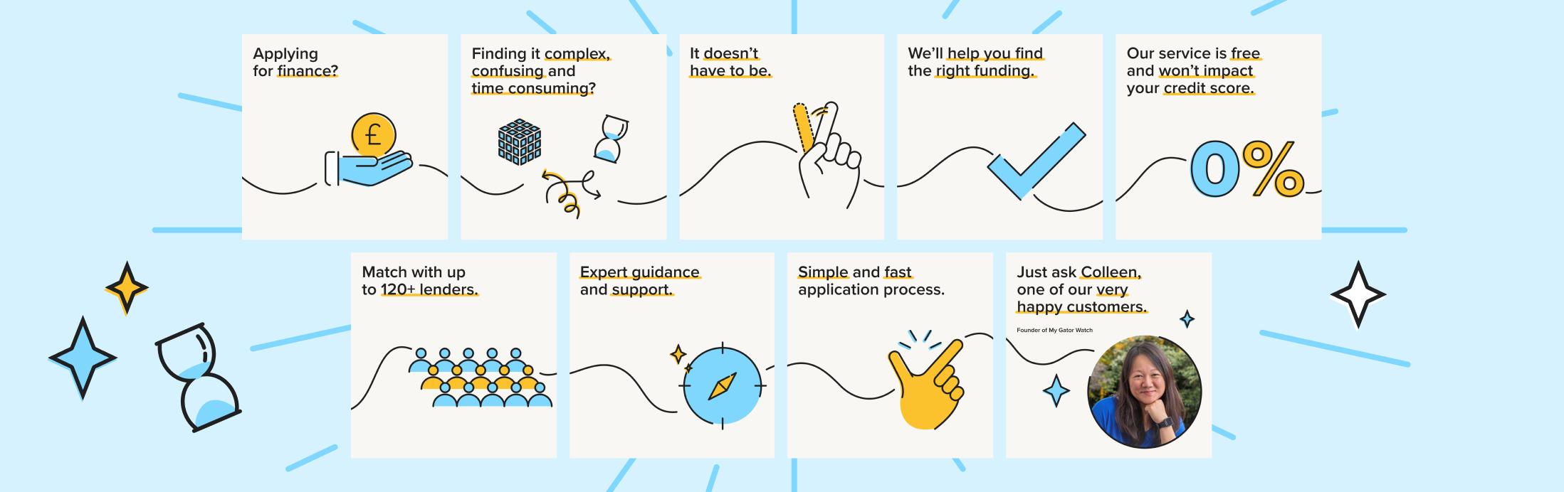 With the messaging in place, we created a visual style for the look and feel of the campaign and product launch. Funding Options had already begun stripping back its core brand elements so that it could build a new direction. This gave our design team a degree of freedom to inject new creative elements and develop a best practice for animation and video that could be used in the future.