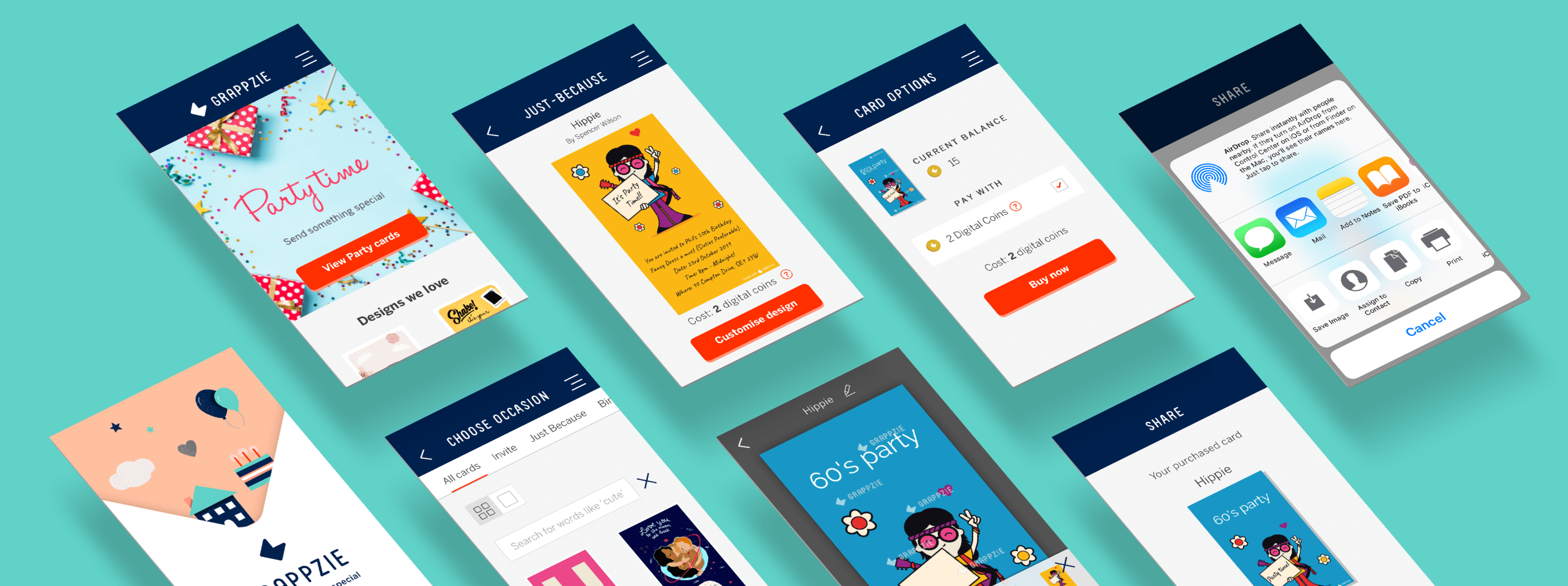 Grappzie is an app where users can create bespoke greetings, invitations and personalised designs in minutes, then share them digitally through WhatsApp (especially Groups), iMessage, email etc. The platform also provides high-quality, on-demand physical prints, so users can send their cards and designs through the post. We helped design and build the brand and develop the product, and we had such faith in the product and concept that we also became a key investor for the company.