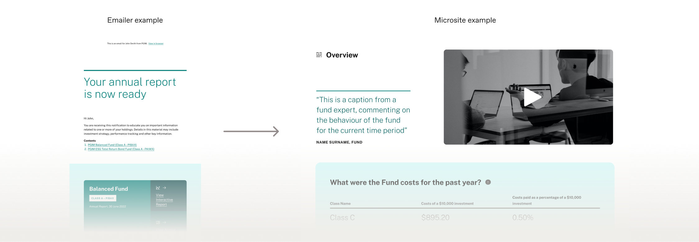 Another change in the SEC regulation was to make the process greener. Printing and sending hundreds of reports and thousands of pages to shareholders isn’t the most environmentally friendly method. Our solution altered this approach with a digital experience, designing a microsite to house the multiple reports needed by investors with multiple share classes.