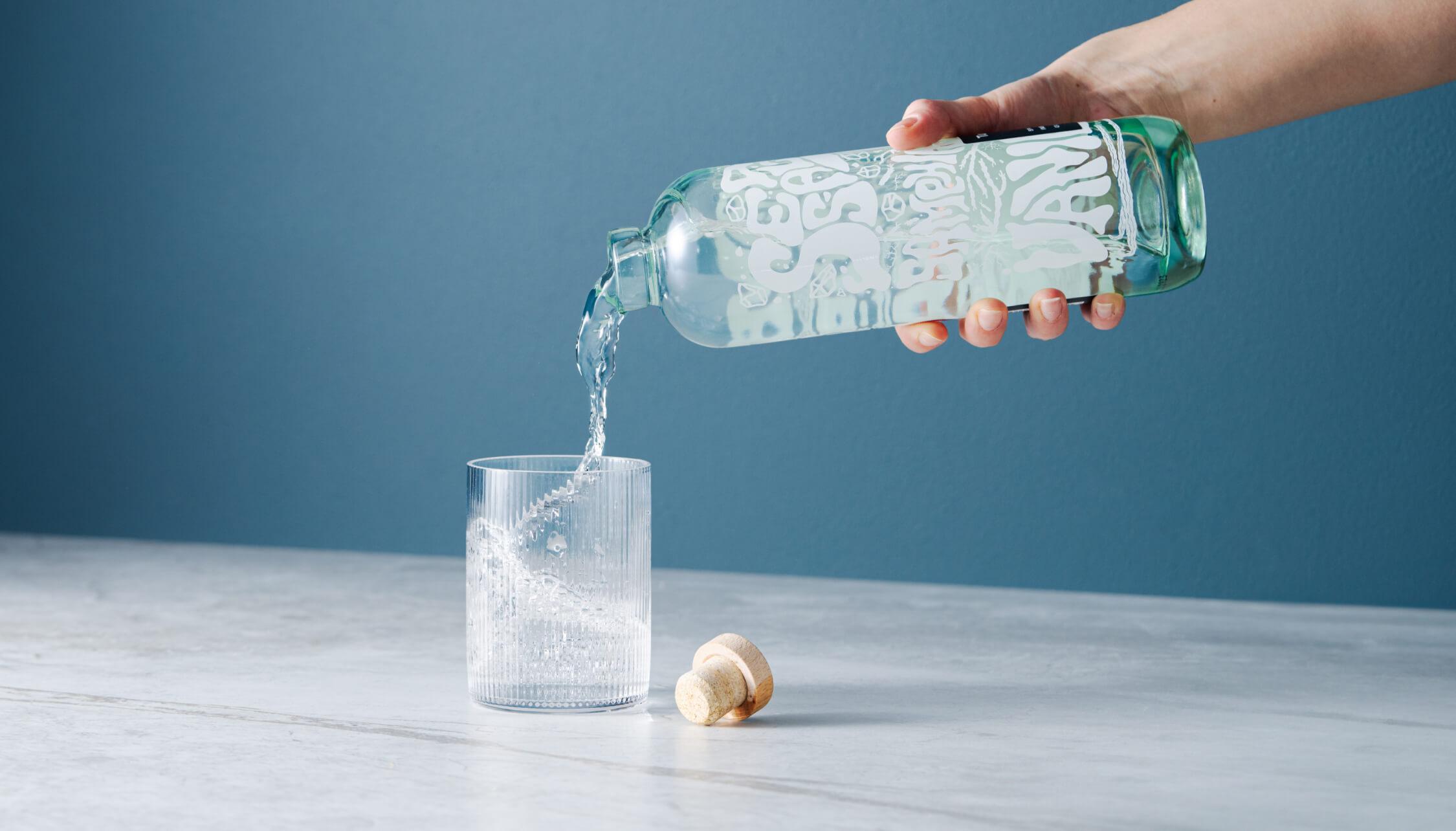 Each bottle is made from 100% recycled glass and screen printed (using sustainable ink), with custom-drawn artwork and lettering that highlights the ingredients. It’s overlaid with a 100% recycled ECF paper label, printed with soy inks and the cork is sealed with a fully compostable, plant-based shrink wrap.